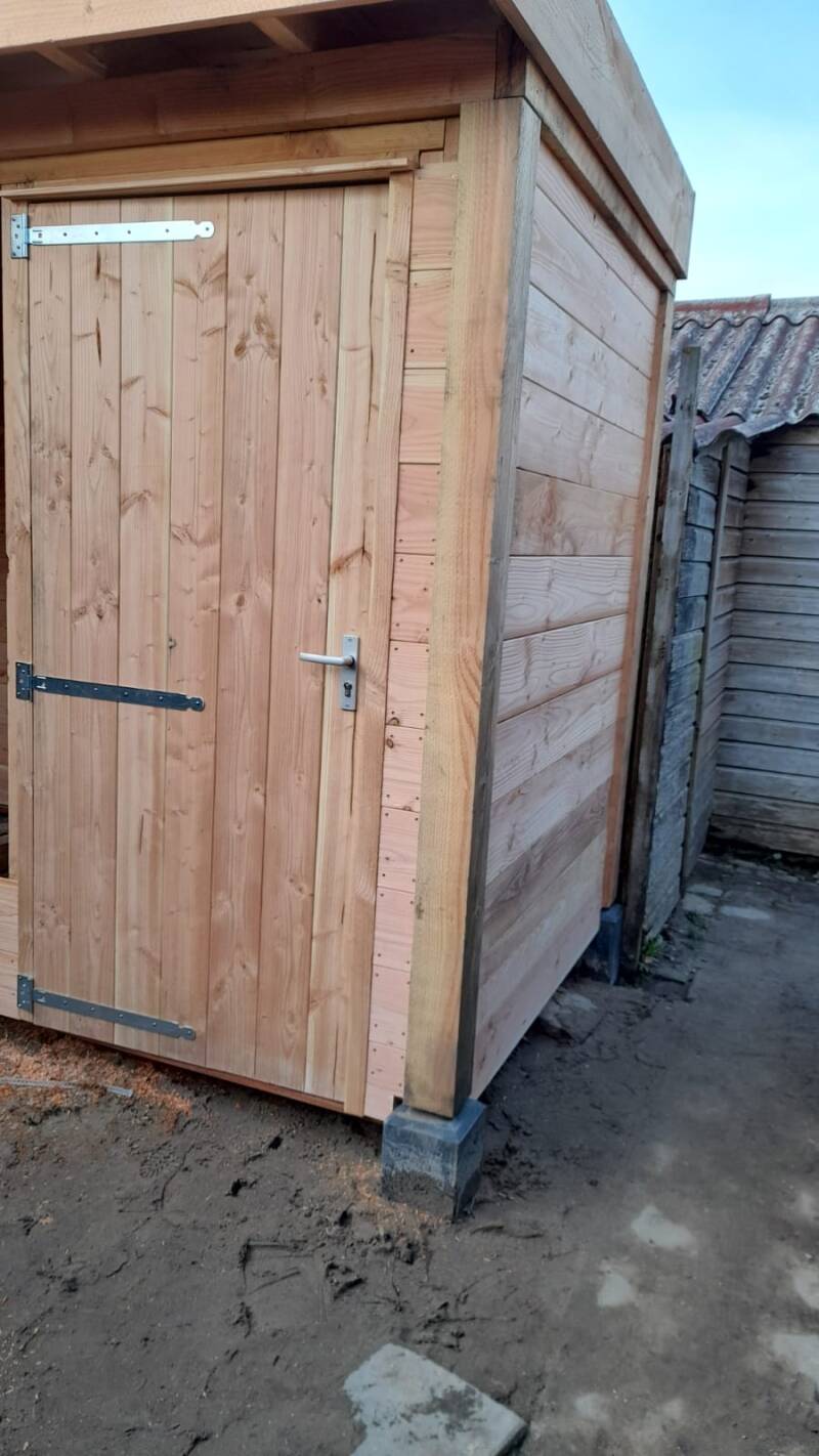 Complete schuur met overkapping geplaatst en voorzien van spots.