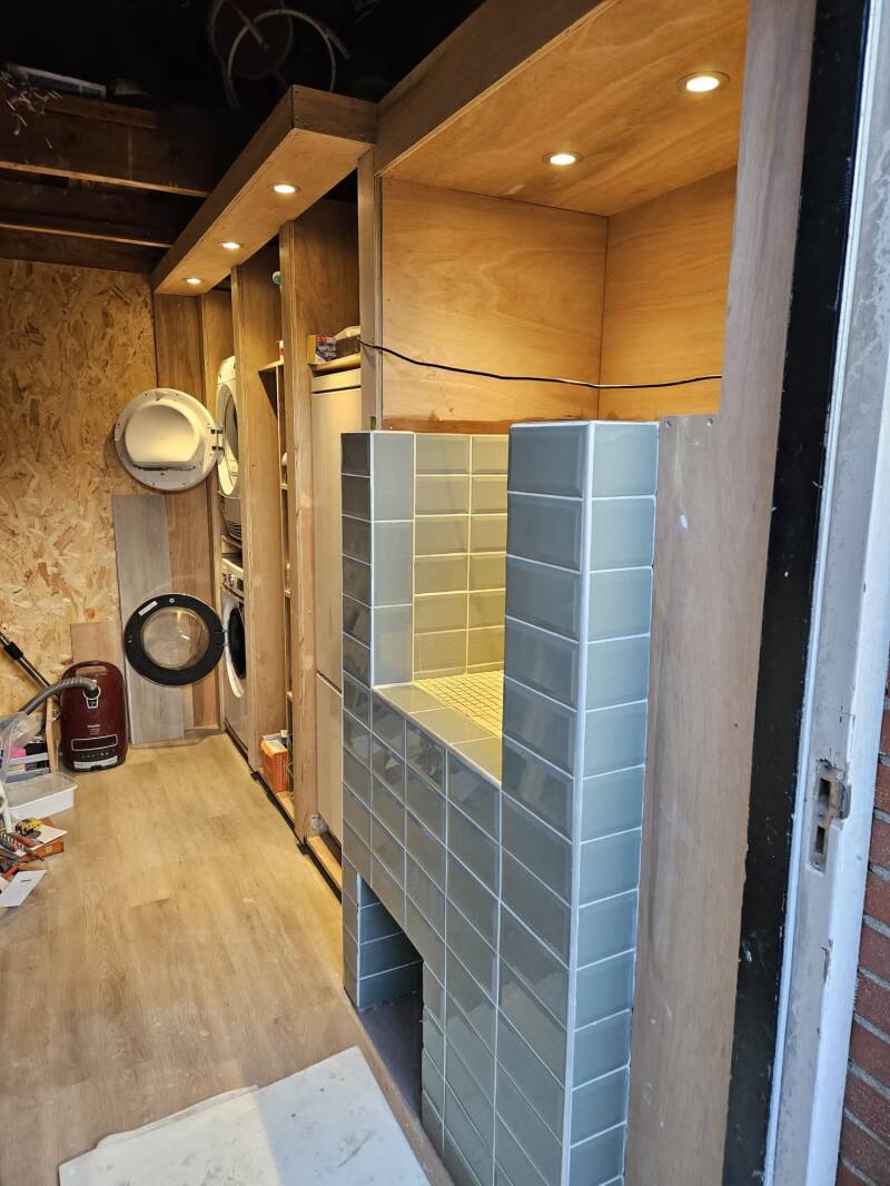 Op maat gemaakte wandkast voor wasmachine en droger inclusief aansluitingen, opbergruimte en een "doggy wash"