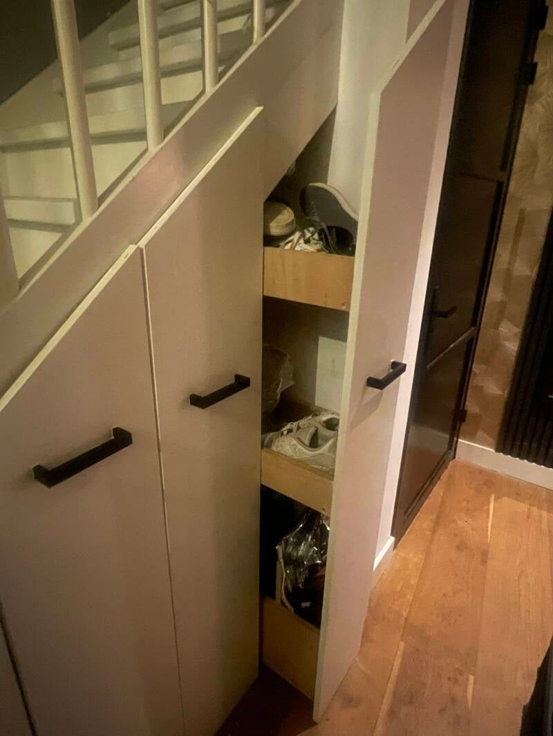Uitrolbare trapkast op maat gemaakt, nieuw behang, wandpanelen geplaatst, nieuwe toilet deur geplaatst inclusief infrezen scharnieren en deurbeslag.